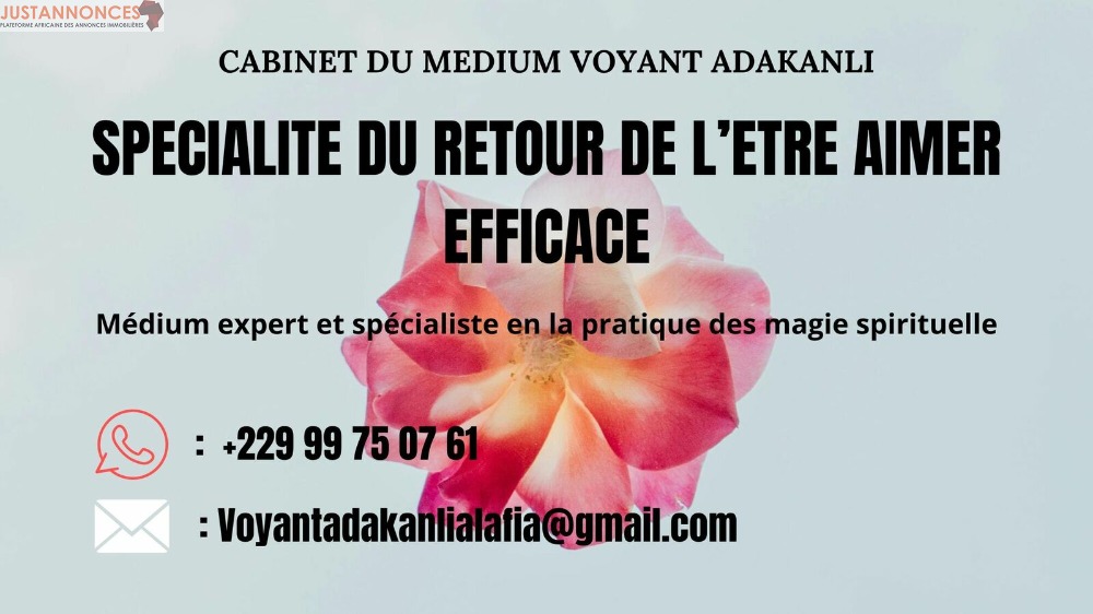 Le medium sérieux adakanli utilise une magie très puissante qui permet de résoudre tous vos problèmes sentimentaux dans Honnêteté, efficacité et rapidité, surtout en discrétion totale , retour de l’être aimé en moins d’une semaine. Il a un taux de réussite proche de 99.9% pour ne pas dire 100%. Quelque soit le problème que vous avez dans votre couple vous aurez la satisfaction avec le Maître Suprême des Marabouts compétent adakanli qui est un spécialiste du retour affection rapide reconnu un peu partout Il s’agit d’une Magie très ancienne dont Il est seul qui détiens ces secrets.