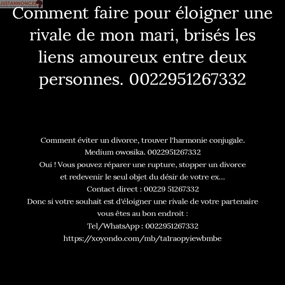 Je suis disponible à tout moment pour vous apporter une solution efficace afin de vous aider à créer l'harmonie conjugale. . même si votre souhait est d'éloigner une rivale qui dérange votre couple, sachez que mes rituels sont efficaces et je suis disponible pour apporter une solution adaptée à votre situation amoureuse